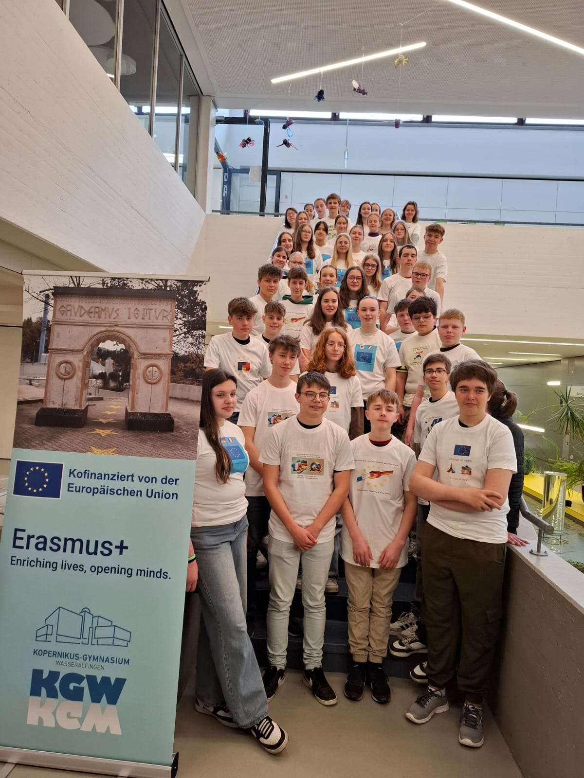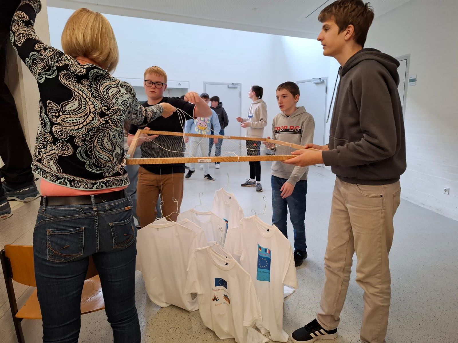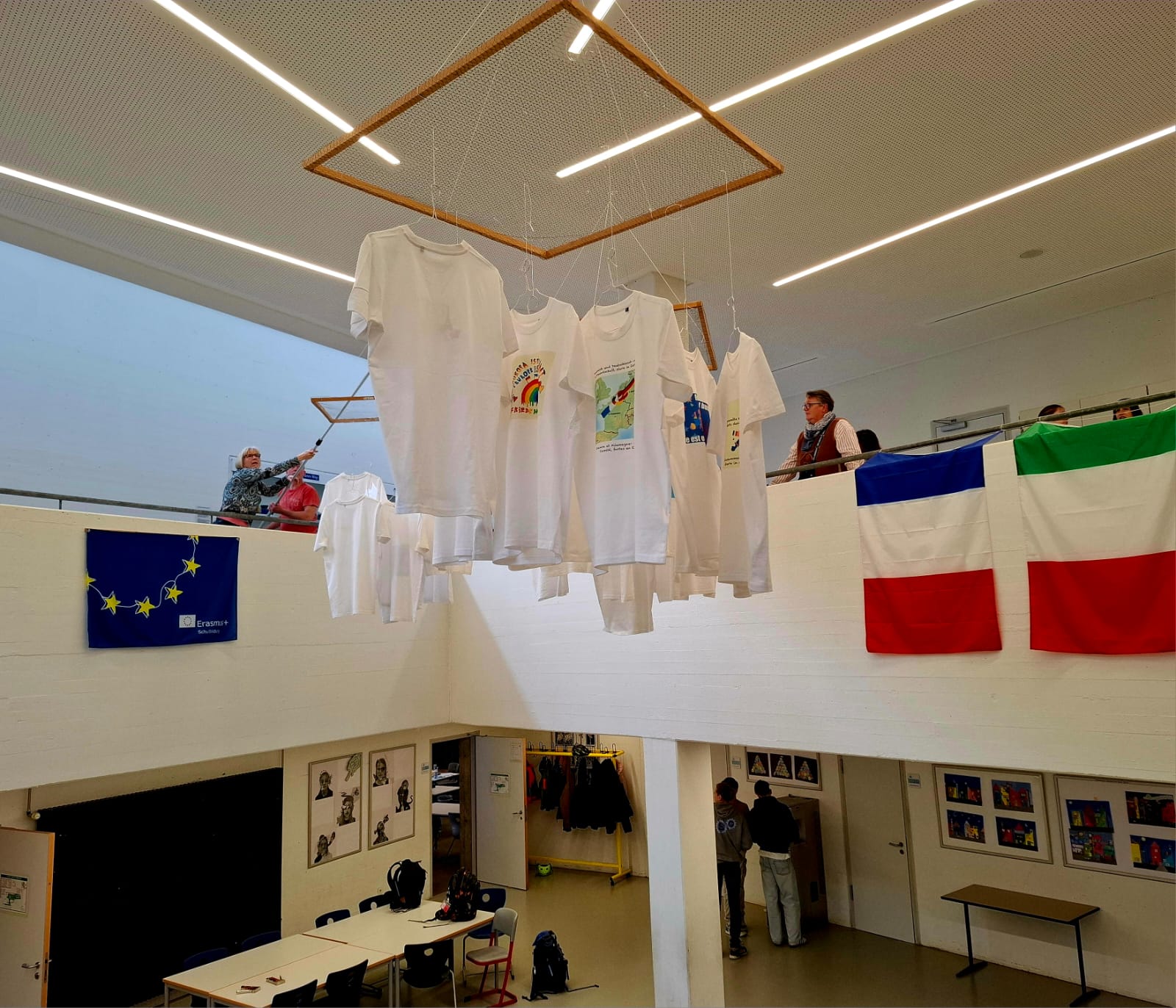 Die „deutsche“ Hälfte der T-Shirts wurde anschließend auf Kleiderbügel gezogen und als „Dummies für junge Europäer“ in Gestalt eines Riesenmobiles an die Stelle des Mobiles gehängt, wo seit dem Frühjahr 2024 die deutsch-spanische Koproduktion „Europäische Werte multilingual“ im Zentrum unseres Schulfoyers über dem Fischteich schwebte.