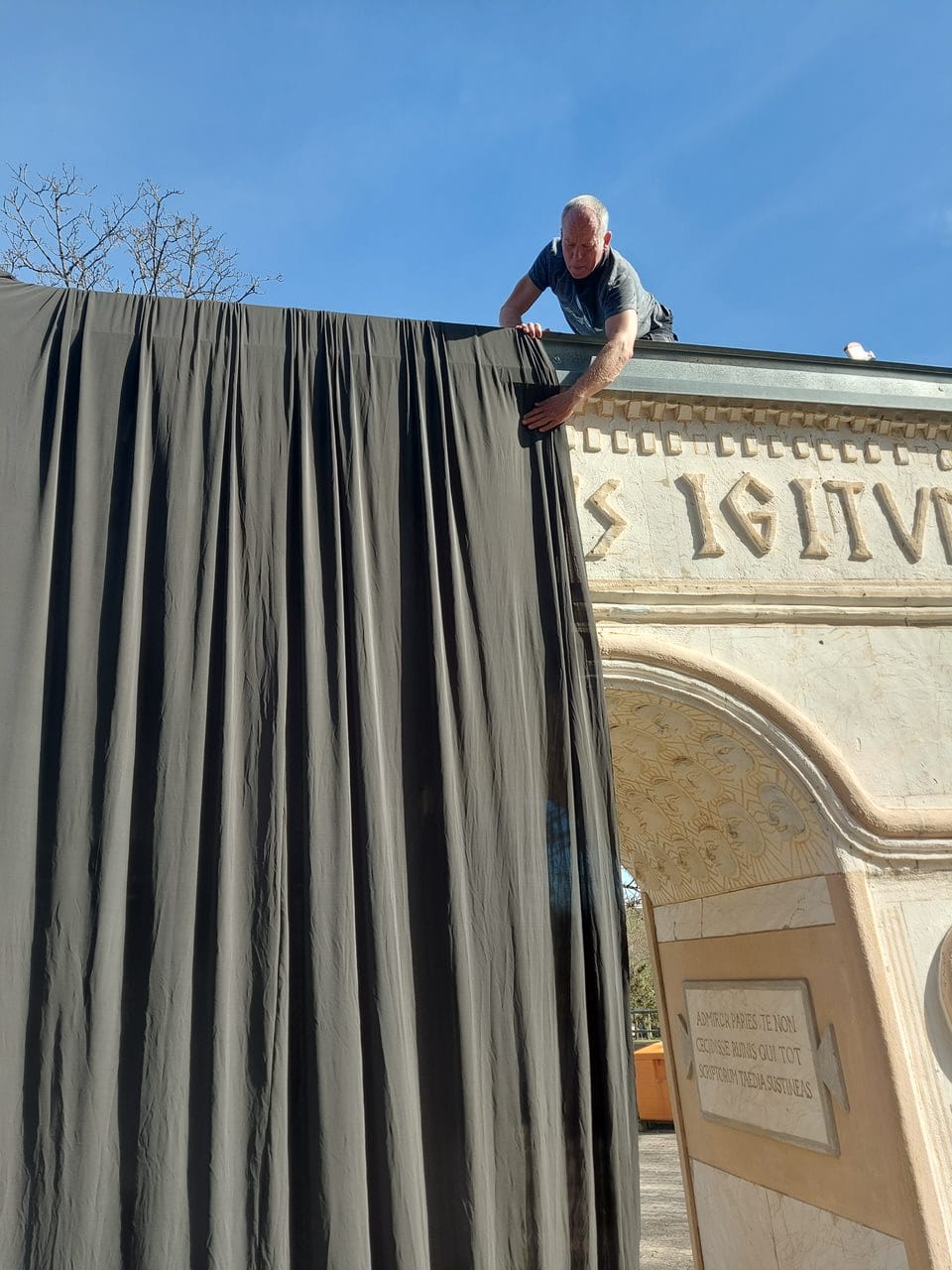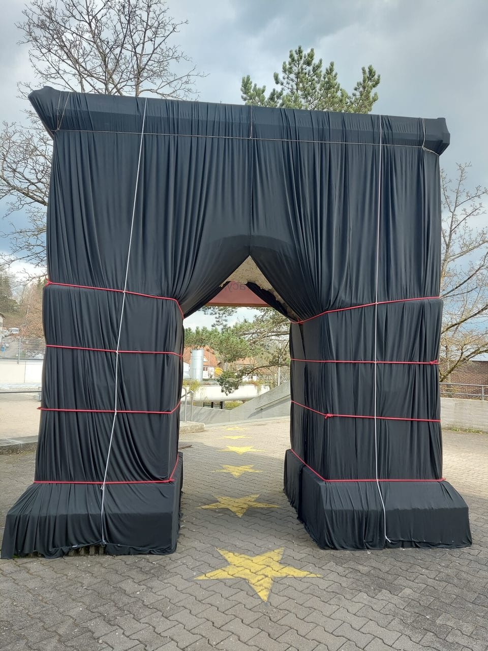 Während des Aufenthalts unserer Partner aus Iseo wurde das Projekt der Triumphbogen-Verhüllung in die Tat umgesetzt. Die bereits gefertigten Stoffbahnen wurden in wagemutiger Gemeinschaftsarbeit und mit tatkräftiger Unterstützung unseres Hausmeisters am Bauwerk angebracht und nach dem Vorbild Christos kunstvoll gerafft und drapiert.